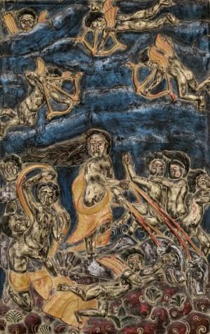 Ouvrant en triptyque à décor de scènes religieuses, bois sculpté...