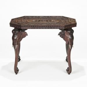 Bois sculpté à décor de trois personnages entourés de deux éléph...