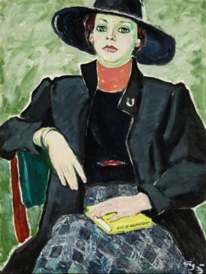 Femme au chapeau noir et au livre de Maupassant, huile sur toile...