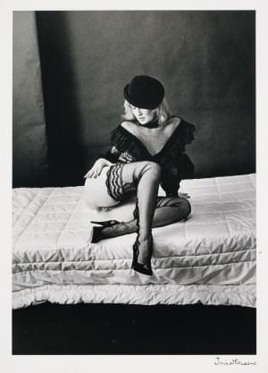 Jeune femme en collants résille, tirage argentique en noir et bl...