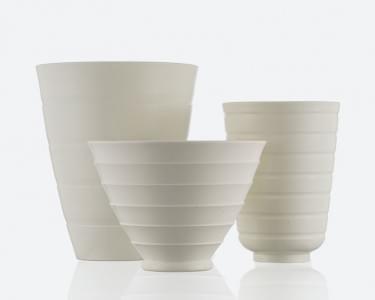 Groupe de trois vases, faïence fine émaillée blanc, Wedgwood, ci...
