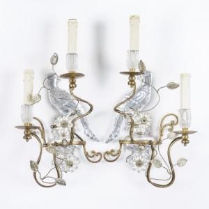 Paire d'appliques au perroquet à deux lumières, métal doré et ve...