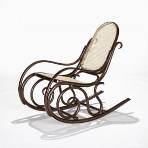 Fauteuil à bascule, assise et dossier cannés, bois thermoformé