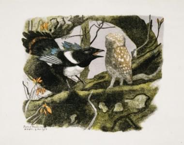 Pie et chouette, Bernex, 4 mai 1958, bois gravé, 36x45 cm