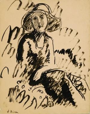 Élégante avec chapeau, encre sur carton marouflée sur toile, sig...