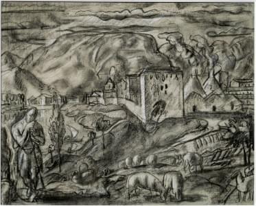 Paysage au berger et déjeuner sur l'herbe, deux fusains et craie...