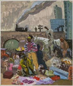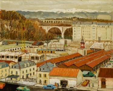Marché devant le viaduc, gouache sur papier, 43x36 cm