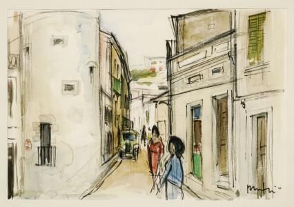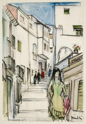 Le départ au marché, gouache sur papier, signée, 18x23 cm