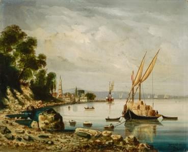 Lac Léman aux rives animées, huile sur toile, 73x69 cm