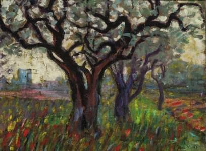 Verger, huile sur carton, signée, 26x35 cm