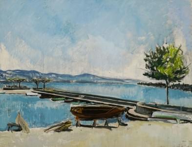 Bateau sur la rive du lac, huile sur toile, signée, 24x33 cm