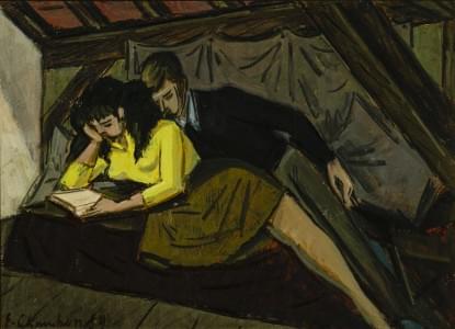 La lecture attachante, huile sur carton, signée et datée 59, 24x...