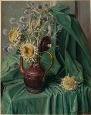 Nature morte aux chardons, huile sur toile, signée, 82x64 cm