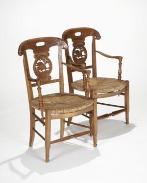 Dossier médaillon, hêtre mouluré et sculpté (deux fauteuils avec...