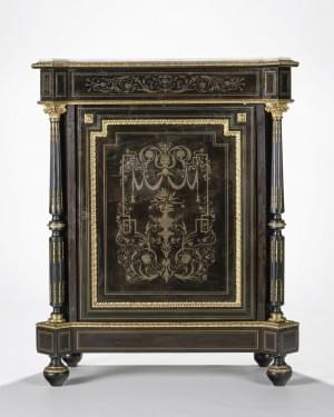 Deux tiroirs, bois de placage marqueté en feuille, bronze, marbr...