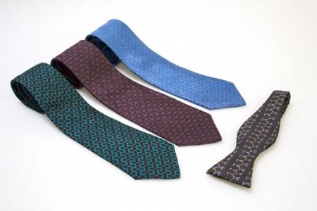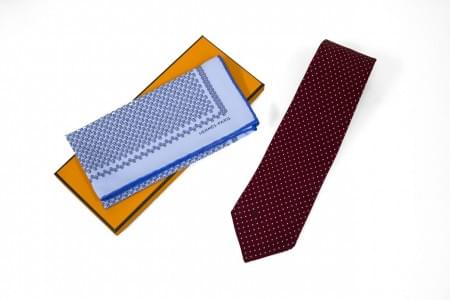 Petit carré à décor de champignons sur fond bleu et une cravate...