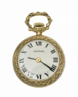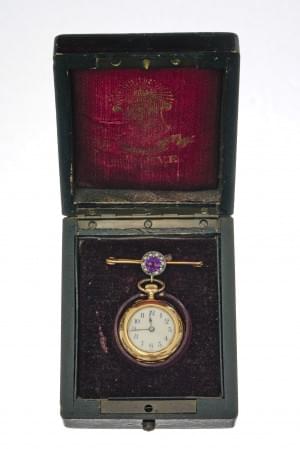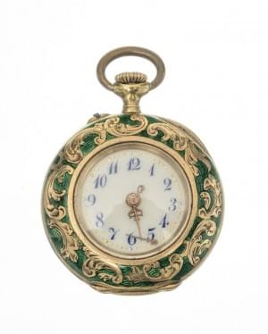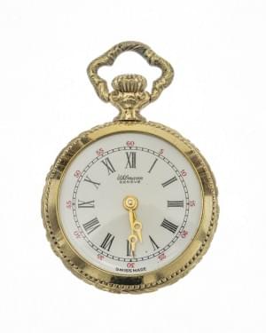 3074. Montre de poche retenue par une barrette sertie de pierres en ve...