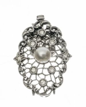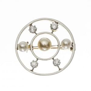 3060. Broche ronde sertie de trois perles entourées de quatre diamants...