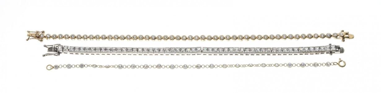 3066. Lot de trois bracelets lignes sertis de pierres blanches d'imita...