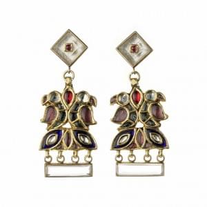 3129. Paire de pendants d'oreilles émaillés sertis de cristal de roche...