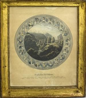 Gravure en taille douce sur papier rehaussée d'aquarelle illustr...