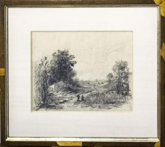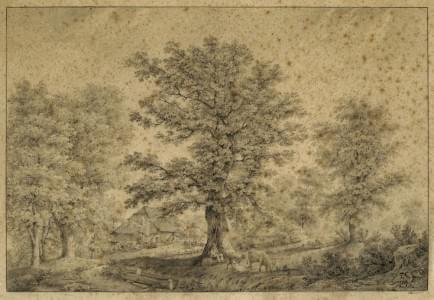 Grands chênes près de la ferme, mine de plomb sur papier, signée...