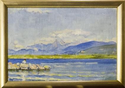 Vue sur lac Léman, huile sur toile, datée 1912, 25x37 cm