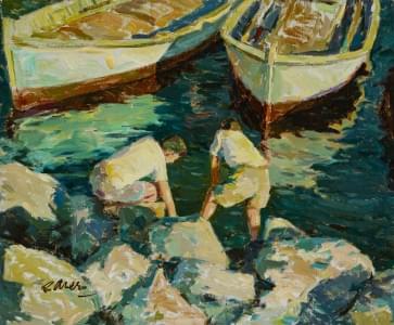 Garçons au port, huile sur toile, signature non identifiée, 46x5...