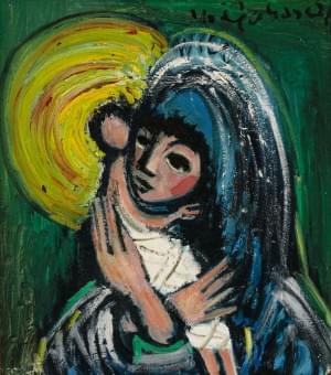 Vierge à l'enfant, huile sur panneau, signée, 42x36,5 cm