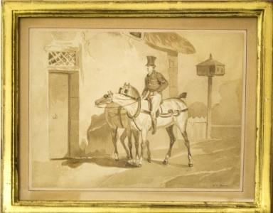 Cocher ramenant les chevaux, lavis sur papier, signé, 19x15 cm