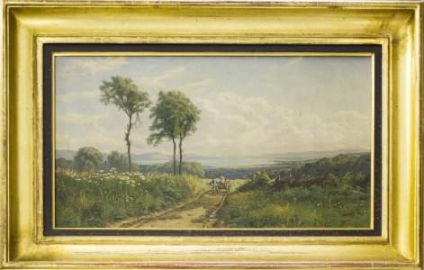 Paysage animé, huile sur panneau, tampon de la collection B.Toma...