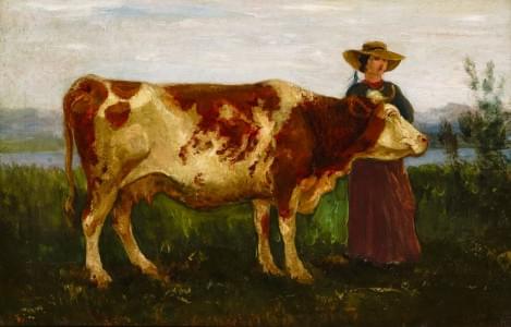 Paysanne et vache, huile sur toile, signée au dos, 34,5x54,5 cm