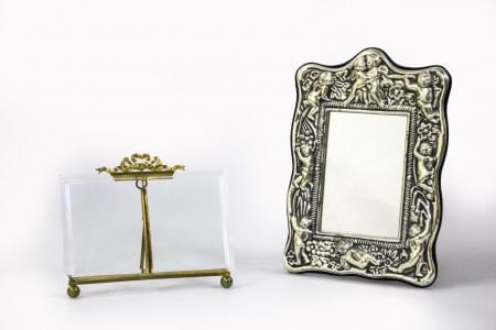 3679. Cadre à photographie et miroir de table à décor de ruban noué et...