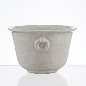 Coupe à anses anneaux, céramique émaillée blanc craquelé, signée...
