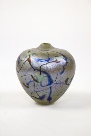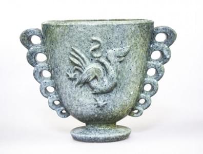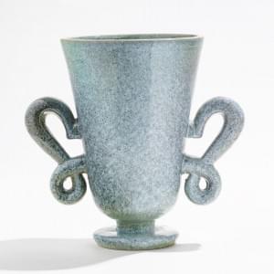 Vase à anses à volutes, céramique émaillée vert bleu à décor d'u...