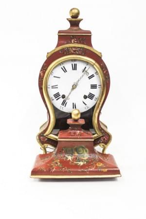 Bois laqué rouge et or à décor peint de fleurs, cadran en émail...