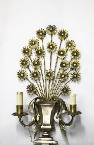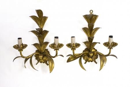 Paire d'appliques à deux lumières à décor feuillagé, métal doré,...