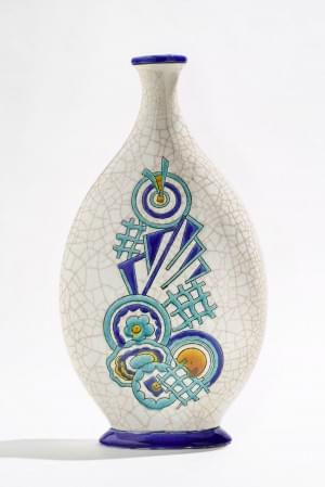 Vase à décor géométrique, faïence émaillée blanc, bleu et jaune,...