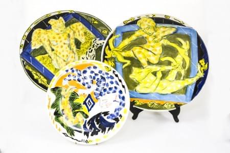 Trois plats, céramique peinte à décor de personnages, D 40 et 31...