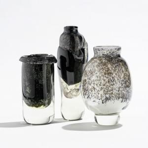 Trois vases, verre à marbrures noires et roses, signés et datés...