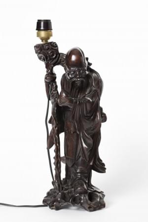Bois sculpté et patiné, monté en lampe, H 41 cm