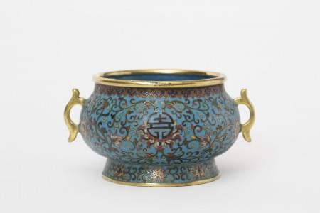 Cuivre et émaux à décor de fleurs sur fond bleu, anses latérales...