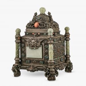1078. Grand coffret en argent à colonnettes et plaques de jade, art si...