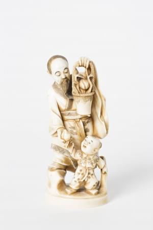 1086. Okimono, homme au panier de pêches et enfant, Japon, circa 1900