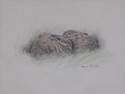 Deux lièvres, craie et mine de plomb sur papier, signé, 23,5x31...