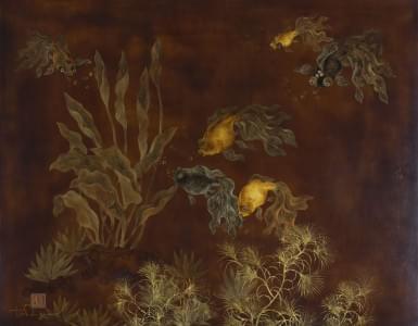 Poissons, panneau en laque, signé, 40x50 cm