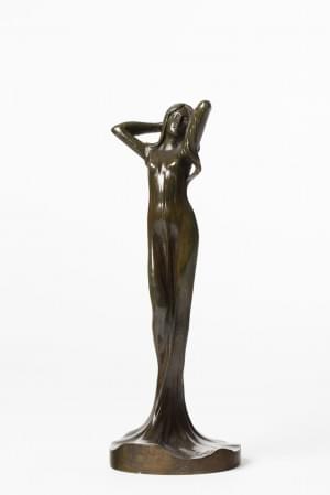 Femme nue les bras levés, bronze à patine verte, signé, H 22 cm