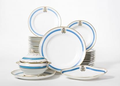 618. Service à dîner à décor de ruban bleu et or monogrammé RC sous c...