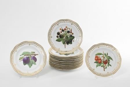 634. 11 assiettes en porcelaine ajourée à motif de fruits