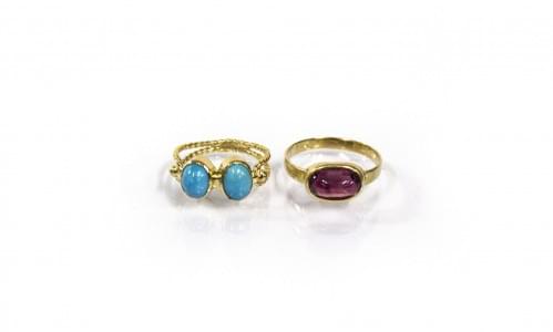 3103. Lot de deux bagues, l'une sertie de deux turquoises en cabochon...